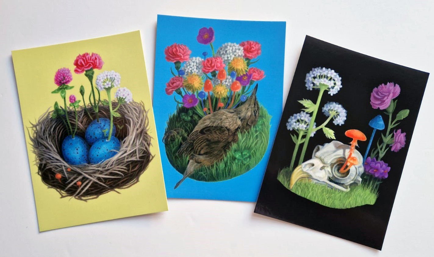3 postcards featuring my goauche paintings. Gloss laminated on one side measuring 10.5 x 14.8cm (A6 size).